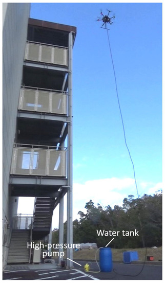 The experimental results are shown in Figure 13. Figure 11A shows a time series of the graph in Figure 12B. The multirotor was able to maintain its position with an accuracy of ±0.1 m relative to the target position. The error was larger than in the previous water jetting experiment, and the reason was that the wind velocity was larger than before. In addition, the wind velocity was not constant because the building blocked the wind in some areas. Figure 13B shows the velocity of the multirotor during water jetting; the velocity change in the direction of the water jet is within about ±0.05 m/s. It was confirmed that the reaction force generated by the water jetting was actually suppressed during the washing task. Figure 13C shows the attitude change of the multirotor during the flight. The roll and pitch angles of the multirotor UAV changed by ±2 degrees during the flight, and the posture was also considered as kept almost horizontal. The yaw value shown in the graph indicates the angle between the direction of the multirotor and the wall surface, which could be controlled with an error of about ±1 deg. In addition, according to the experiment results of water injection testing and washing task, the similarity of the two experimental results suggests that the reaction force generated by the water jet would be constant regardless of the presence or absence of a wall. On the other hand, it was confirmed that the developed aerial robot can perform high-pressure washing tasks up to 12 m from the ground (see Figure 14). This experimental video can be available at the Supplementary Materials. Moreover, the weight of the hose is 200 g/m, and considering the loadable weight of the UAV, it is estimated to be between 15 and 20 m. considering the weight of the UAV’s payload, 15 to 20 m seems to be the limit. Based on the above, it was verified that the proposed method can be used for washing tasks while facing the wall vertically and keeping a constant distance from the wall.