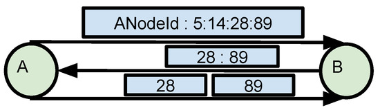 Vahdat and Becker [37] proposed a session strategy that is utilized in Epidemic, Spray and Wait, and SCR. Figure 3 shows an example session between nodes A and B. Considering that node A and B have encountered each other, node A will send its ID, concatenated with the message IDs that node A has in its buffer. In this example case, node A has messages with IDs 5, 14, 28, and 89. Once node B receives this message, node B replies with a message containing the message IDs that node B does not have. Node A sends the requested messages, with IDs 28 and 89, to Node B. Once the message exchange finishes, the same session strategy is repeated for node B and node A. At the end of the next session, the messages between A and B will be synchronized.