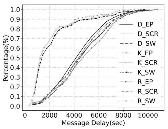 - KAIST Dataset: KAIST dataset contains 22 movement traces of students in KAIST campus for 83,970 s which equates to more than 23 h. The width of the simulation environment is 13,226 m by 19,208 m. We have removed the traces that are shorter than 2 h in the original KAIST dataset, leaving 22 movement traces.