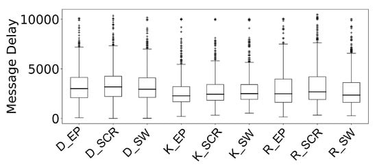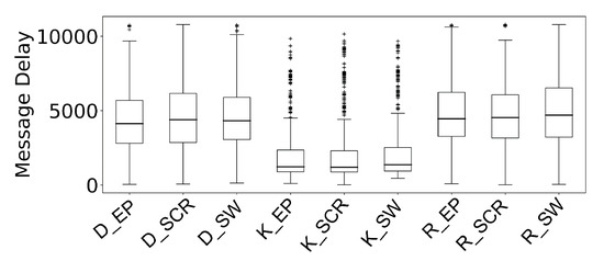 Message delay is defined as the time elapsed from creation until receipt of the message. Message delay is calculated for every message created during the simulation. Figure 4 and Figure 5 shows the cumulative distribution of message delay in the NCSU and KAIST datasets, respectively. To better visualize the message delay, we use box plots to present the data.