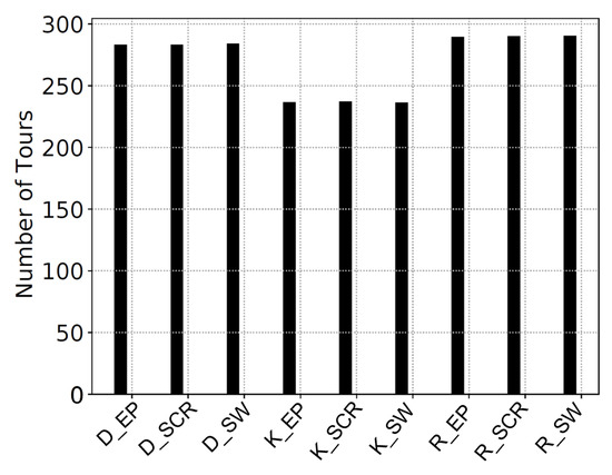 Figure 12 and Figure 13 shows the number of tours made by the UAVs when each of the nine schemes is used in the NCSU and KAIST datasets, respectively. A tour begins when a UAV takes off from the charging station until it returns and lands at the charging station again. Meaning that every time a UAV takes off it starts a new tour.