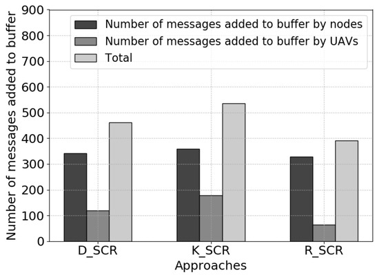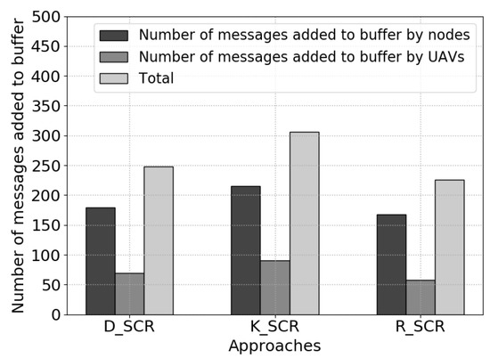 When an encounter session is initiated, the nodes and UAVs exchange protocol messages, as well as actual messages. The more actual messages exchanged between nodes, the more efficient the communication becomes in an opportunistic network. If the number of messages added to buffers is small, it can be interpreted as the messages are not being distributed efficiently. For both datasets, K-Means shows a higher number of messages added to buffer comparing to DBSCAN and randomly places charging stations. Figure 16 and Figure 17 shows the number of messages added to buffer.