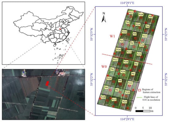 The study site is located in the 14th branch of the state farm in Shangshui County, Zhoukou City, Henan Province (33° 32′ 2.9″ N, 114° 29′ 1.0′′ E), China (Figure 1). The soil type is sandy ginger black soil (Chinese soil classification system). Five nitrogen levels were set in the plots: N0 (0 kg hm−2), N6 (60 kg hm−2), N12 (120 kg hm−2), N18 (180 kg hm−2), and N24 (240 kg hm−2), of which 50% was applied as a base fertilizer and the remaining 50% was applied at the jointing stage. All treatments had 150 and 90 kg hm−2 of phosphorus and potassium fertilizer, all of which were applied as base fertilizers. Two levels of soil moisture management were used: W0 (rainfed) and W1 (irrigated). The area of each experiment plot is approximately 42 m2, with the spatial distribution of the plot shown in Figure 1.