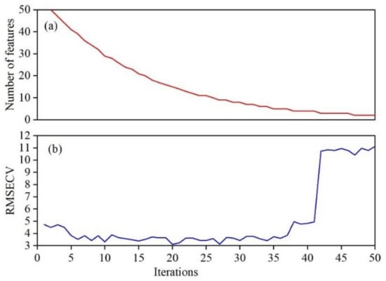 The competitive adaptive reweighted sampling (CARS) was used for feature selection during the plant nitrogen content model construction. The CARS is a feature selection method that combines Monte Carlo sampling with regression coefficients from a partial least squares model and is widely used for sensitive feature selection of multiple independent variable models [,]. In the CARS algorithm, each feature selection is performed by adaptive reweighted sampling to retain the points with larger weights of the absolute values of regression coefficients in the partial least squares model as a new subset and to remove the points with smaller weights. Then, a partial least squares model is built based on the new subset, and after several calculations, the variables in the subset with the smallest root mean square error of cross-validation (RMSECV) of the partial least squares model are selected as the preferred features.