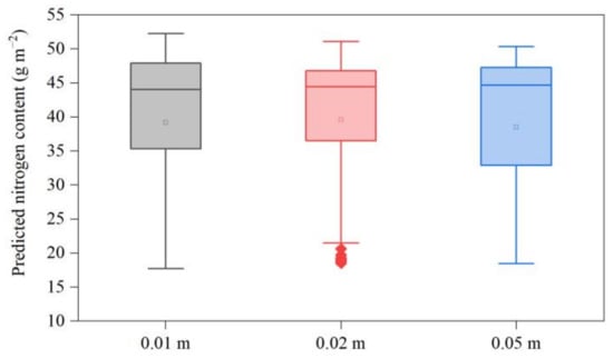 The 16 spectral and texture features were used by the RF method to construct the prediction models for plant nitrogen content in winter wheat at different image spatial resolutions. The scatterplots between the measured and predicted values are shown in Figure 4. The performance of the models constructed differed with different image spatial resolutions. The R2, the RMSE, the MAE and the RPD of plant nitrogen content prediction model constructed with 0.01 m resolution image features were 0.84, 4.57 g m−2, 2.50 g m−2 and 2.34, respectively; they were 0.86, 4.15 g m−2, 2.82 g m−2 and 2.65 for 0.02 m resolution image features, and 0.92, 3.17 g m−2, 2.45 g m−2 and 2.86 for 0.05 m. Considering the R2, the RMSE, the MAE, and the RPD of the three resolution models, the model constructed by 0.05 m resolution image features was the best. In addition, the results of one-way ANONA (Figure 5) indicated that the differences in the plant nitrogen content predicted by the three models were not significant.