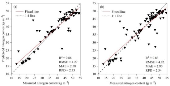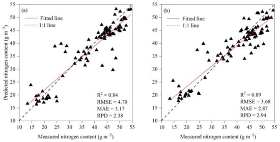 The model evaluation is conducted using a number of metrics including the coefficient of determination (R2), the root mean square error (RMSE), the mean absolute error (MAE), and the relative predictive error (RPD) between the field measured and model predicted plant nitrogen content. The larger the R2 and the PRD, the smaller the RMSE and the MAE, and the better the model prediction and transferability. When the predicted value matches exactly with the measured value, MAE = 0, i.e., perfect model. When the RPD ≥ 2, it indicates that the model has an excellent predictive ability, when 1.4 ≤ RPD < 2, it indicates that the model can make a rough estimation of the sample, while the RPD < 1.4, it indicates that the model cannot be to predict the sample [,].