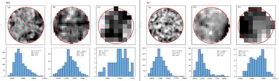In addition, taking the calibrated image of the Redege band as an example, Figure 8 shows the spatial characteristics and corresponding histograms of the winter wheat canopy with different image spatial resolutions in the same region with a fixed center and a radius of 0.2 m under W0 and W1 treatments. It can be seen that the high-resolution image has richer canopy structure information; however, as the spatial resolution decreases, the image characteristics become relatively “pure pixels”. When a circular polygon with a radius of 0.2 m is used to clip the Redege band images of 0.01, 0.02, and 0.05 m spatial resolutions, it covers 126, 71, and 25 edge pixels, respectively, which are related to the useful information from image spectral and texture features (Table 4). Additionally, other studies showed that the leaf area index, transpiration, biomass, and plant height of the crop change with different water conditions [,,]. In this study, the texture features of the images with different water treatments in Figure 8 also showed that there were differences in the canopy characteristics of winter wheat between the W0 and W1 treatments. For example, the mean calibrated Rededge image DN values of the W0 treatment were 14,029.77, 12,821.65, and 11,928.30 for 0.01, 0.02, and 0.05 m spatial resolution UAV images, respectively, and the mean DN values of the W1 treatment were 12,445.56, 12,606.55 and 11,467.76, respectively. The difference between the two DN values were 1584.21, 215.1, and 60.54, respectively; this suggests that water treatment (irrigation) has a more pronounced effect on images with high resolutions (0.01 m) than low resolutions (e.g., 0.05 m).