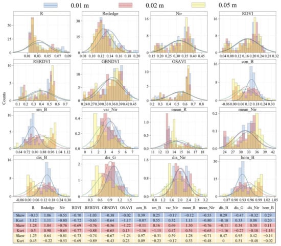 Moreover, this is also demonstrated in Figure 9 using the histograms of the selected spectral and texture features by CARS. As the image resolution decreases, the Skew and Kurt differences of the spectral and texture features tend to decrease, indicating that the data itself tends to be more “normally distributed”, and the good data characteristics also provide a guarantee for the construction of models with better prediction and transferability.