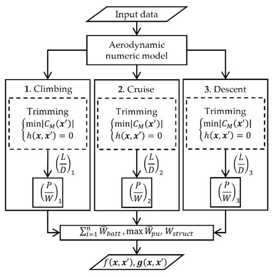 Figure 6) and did not require a separate cycle for its convergence. The take-off weight, as a design variable, was solved by the sizing equation with the optimization process (without the need for an extra iteration process for the equation convergence) by narrowing the upper and lower take-off parameter values after each iteration. The lower and upper take-off parameter bounds are updated to the minimum and maximum L(