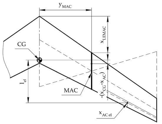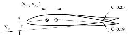 An increase in static stability leads to an increase in pitch movement. Trimming the UAV, in this case, is ensured by deflecting the elevons upward, or by using airfoils with a more upward leading-edge angle. The lift coefficient required for the horizontal flight can be maintained by increasing the angle of attack (