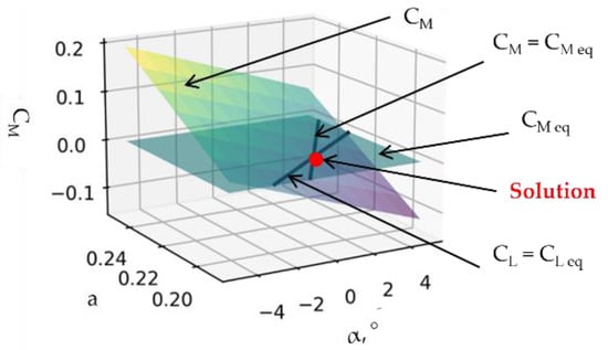 The combination that trims the aircraft has parameters α = 1.13° and C = 0.2080. The found point coincides with the point by using the COBYLA algorithm (see