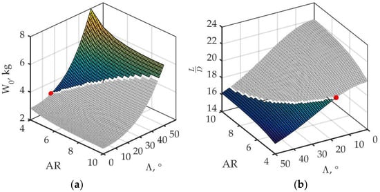 Figure 8b) at other “frozen” parameters were plotted. The intervals at which the target function has been calculated are for aspect ratio, from 4 to 10; leading-edge sweep angle, from 0 to 50; wing loading, from 3 to 10 daN/m