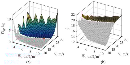 Figure 8b shows the response surfaces at a specific wing loading of 6 daN/kg and a cruise speed of 20 m/s.