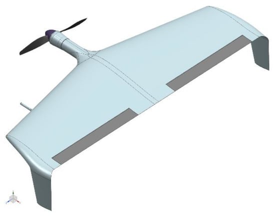 The UAV to be modernized is a UAV “Boomerang”, designed according to the flying wing configuration with a twin-wing vertical tail, and a single-engine propulsion system consisting of a brushless motor. A layout is shown in