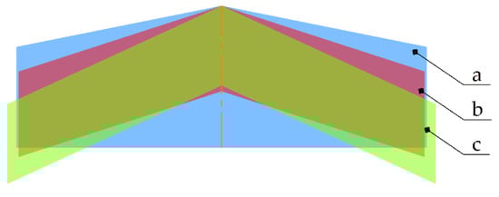 Figure 12a), which can be explained not only by an increase in the wing loading as a consequence of the reduction in the wing structure weight due to the reduction of its area but also by a reduction in the aircraft weight due to the batteries weight reduction, due to the lowering of the specific energy consumption. Despite some increase in flight speed, the decrease in power consumption was achieved due to an increase in the lift-to-drag ratio caused by an increase in the wing aspect ratio and the cruise flight execution at more optimal angles of attack. The reduction in wing structure weight by 32% led to an improvement in the objective function by about 9.8%. This example also clearly demonstrates the effect of the minimum elevon arm constraint in the longitudinal axis on the optimization result: increasing the wing aspect ratio to improve the lift-to-drag ratio also requires increasing the leading-edge sweep angle of the wing to ensure pitch control. The effect of the constraint is clearly visible in the two competing variants B and C, and it is noticeable that these modifications do not differ much in terms of weight summary. The improvement in take-off weight for the “B” and “C” aircraft relative to the “A” aircraft is shown in
