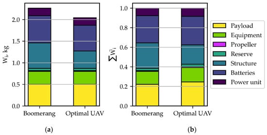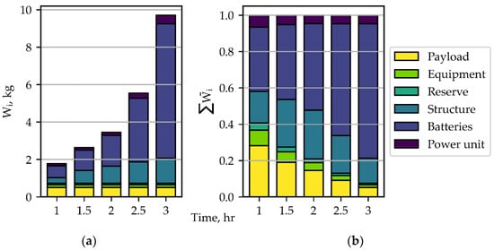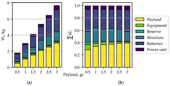 Figure 14, in which the dependence of different weight components on the payload is more intuitive. Moreover, the battery weight increases at almost twice the increment of the structure weight.
