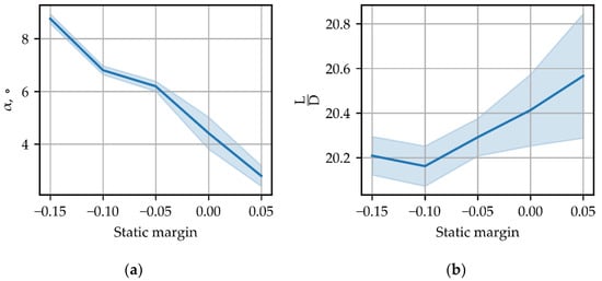 Figure 16 shows the main and standard deviations of the angle of attack and the lift-to-drag ratio. The results of the third case of study show that the angle of attack is highly dependent on the static margin. The angle of attack shows little deviation compared to the lift-to-drag ratio, mainly at margins 0 and 0.5.