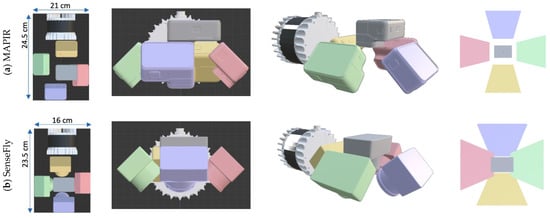 - a novel (simulated) low-cost, low-weight, hybrid, multi-view hybrid acquisition system for UAV platforms (Section 2.1, Section 2.2 and Section 2.3);
