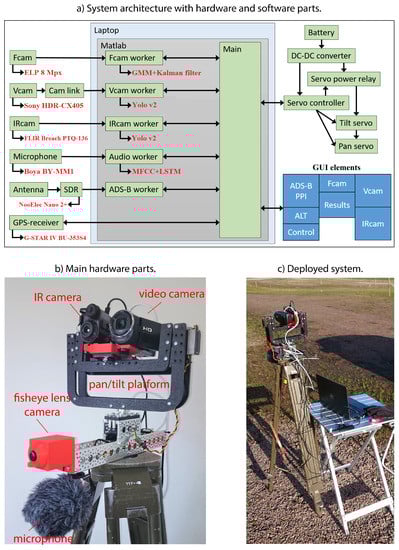 31]. We employ a standard video camera and audio microphone complemented with a thermal infrared camera. These two cameras are steered towards potential objects of interest with a fish-eye lens camera with a wider field of view that is used to detect moving objects at once over a bigger portion of the sky. We also include an ADS-B receiver, which allows for tracking cooperative aircraft that broadcast their vehicle type, and a GPS receiver. We have also evaluated a radar module, which has been finally discarded due to its very short practical range. The sensors are all placed on a pan/tilt platform mounted on a standard surveyor’s tripod. This allows easy deployment of the solution outdoors and portability since the system can be disassembled into a few large parts and placed in a transport box.