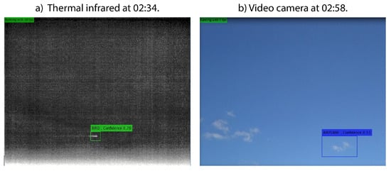 Figure 23 shows the false detections of the thermal infrared at 02:34 and the video camera at 02:58. As described earlier, the individual weaknesses observed for the primary sensors are sensitivity to clouds (thermal infrared) and autofocus problems (video camera). However, the fusion detection pipeline shows that such individual shortcomings can be overcome with a multi-sensor solution.