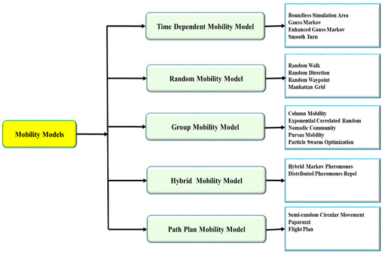 Due to the presence of a 3D environment in UAV ad-hoc networks, it is essential to carefully consider UAVs’ position, movement, and direction [3]. Therefore, to achieve better performance of UAVs in specific applications, different mobility models have been considered. The mobility models utilize mathematical models and simulation environments to offer realistic results scenarios for complex networks. Moreover, UAV ad-hoc network mobility is highly dynamic due to its movement in the air; on the other hand, MANET/VANET nodes move on specific paths, such as vehicles on the roads and streets. Hence, choosing an appropriate mobility model for a particular UAV ad-hoc network scenario is essential. In the below taxonomy, Figure 1 describes the classifications of mobility models.
