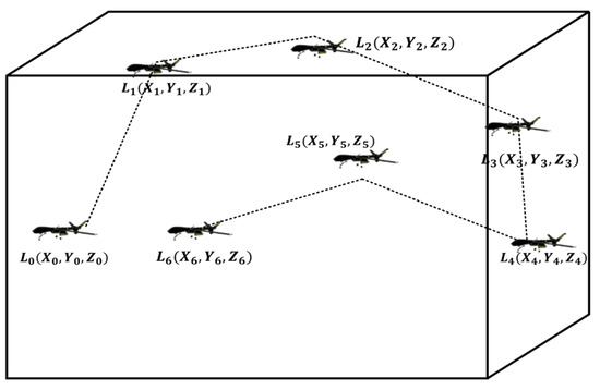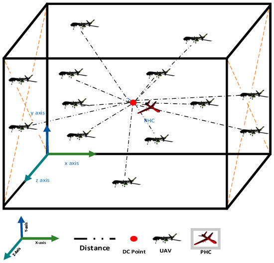 Here, , are the gain at the transmitting and receiving antenna, respectively. Several UAVs move across the wireless network to form a 3D environmental network by taking into account three coordinate mechanisms. Suppose there is a set of where ui represents the UAV. The proposed work utilizes the 3D coordinates to find the position of each UAV by utilizing the Euclidian distance (Equation (4)):