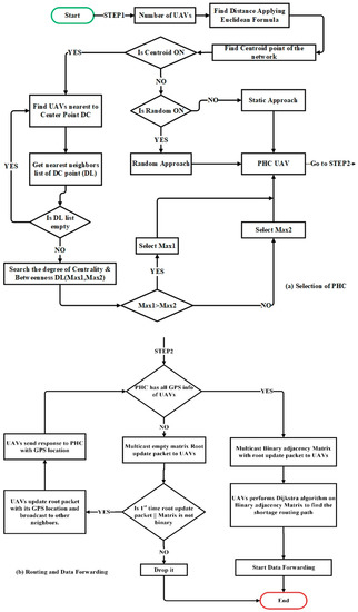The centroid approach selects a PHC-UAV based on the densities of all UAVs and the average paths of the whole network [46]. As demonstrated by the flowchart in Figure 1, this approach is used to find the center point of all UAVs in the network. We have calculated the centroid coordinates accordingly from Equation (14):