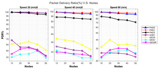 Figure 6 shows the packet delivery ratio (PDR %) results of the three different mobility scenarios, 20, 40, and 60 m/s, versus 50 simultaneously moveable UAV nodes. The PDR of the proposed routing schemes offers better performance in all scenarios under different mobility. The benchmark routing protocols suffer and have low PDR; hence, their performance decreases due to the dynamic nature of nodes and unstable links during simulation time. In the 20 m/s mobility speed, the PDR. of the proposed scheme PHCC is at 95%, whereas the GEO-D routing protocol has a 60% PDR, though it offers better results in all benchmark schemes. In the comparison, at the start, AODV has a 70% PDR but its performance gradually decreases as the mobility increases due to the fact at high mobility, the topology of the UAV ad-hoc network is highly dynamic (unpredictable). Moreover, among our proposed techniques, PHCC gives 3.5% better PDR with static and 2% better PDR with random schemes. Our three proposed schemes offer better results in comparison with benchmark schemes. At 40 m/s, UAVs move at higher speeds; all routing protocols try to maintain the route. As the number of moving UAV nodes increases, the communication links between UAVs across the network change dynamically; as a result, the performance of other protocols decreases. At the start, GEOD tries to have 58%; as the number of moving UAVs increases, its performance decreases, just like other benchmark schemes. On the other hand, PHC-Static’s performance also decreases due to mobility. At 60 m/s, which is the highest speed (suitable for military UAVs), the performance of all our proposed schemes is better than that of all other four-benchmark routing protocols. The GEO benchmark is for the 3D environment, but its PDR is less in our scenario due to the high-speed mobility under the different network environments. GEO cannot maintain the routes quickly; therefore, its PDR decreases. Moreover, the AODV topology scheme’s performance is the worst because there is no stable path across the network. The proposed schemes store the position of each UAV in the routing table (unlike AODV, the UAVs have addresses); therefore, the source UAV knows the position of destination UAV and intermediate UAVs and, hence, can find the shortest path efficiently. Meanwhile, the benchmark schemes’ performances degrade because of their unstable topology (AODV) and no information from UAVs out of communication range (position-based routing).