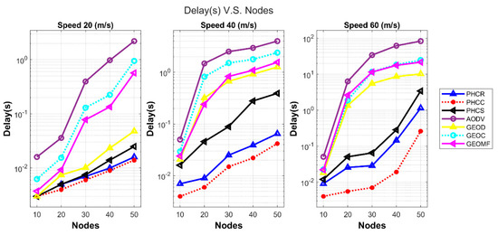 Figure 7 shows the average delay(s) results of the 20, 40, and 60 (m/s) speed scenarios. At 20 m/s, all proposed routing protocols initially perform well with little difference, while GEOD has less delay as compared to other benchmark schemes. The average delays of other versions of GEO (GOEC and GEOMF) and AODV linearly increase as compared to all versions of the proposed routing protocol in the case of connection-10. The centroid version (PHCC) of the proposed routing protocol has about 1% to 70%, 6% to 75%, 7% to 80%, and 2% to 60% lower delay than the AODV, GEOC, GEODMF, and GEOD routing protocols, respectively, as shown in Figure 6. In the 40 m/s case, we further increase the number of moving UAVs in the network for analysis. The GEOC version of the position-based GEO routing protocol generates more delay than other routing protocols in its class of routing. The AODV has about 5% more delay than the GOEC routing protocol, and it has about 3% to 12% higher delay than GEOMF and GEOD, respectively, at 50 moveable nodes. When we compare GEOC with the proposed routing protocol, it has about 50% to 55% higher delay than all variants of the proposed routing protocols. Similarly, we also compare all routing protocols when a speed of 60 m/s is used. Initially, the proposed routing protocol consists of a lower delay. However, as the number of moveable UAV nodes increases, the proposed routing protocol’s network delay(s) also increases. However, all proposed variants of PMHRP have low network delay(s) compared to benchmark routing protocols. The PHCS has a higher delay in proposed schemes due to the fact its PHC is selected by the static approach (not considering the position and other aspects for selection). Furthermore, the PHCC routing protocol shows up to 68% to 75% lower delay than all variants of GEO and 74% lower than AODV routing protocols. The reason behind the lower delay of the proposed variants of the PMHRP is that they have a lower network delay since they contain global routing information. On the other hand, all variants of the GEO routing protocols include local routing information; therefore, they do not control delay efficiently. The centroid variant of the PMHRP has an excellent ability to maintain the network delay, even in high call load scenarios because of its centroid position, and it provides complete routing information to all UAVs by considering the centrality measure values.