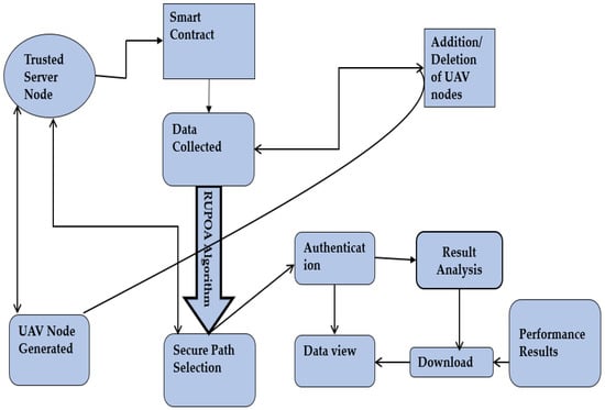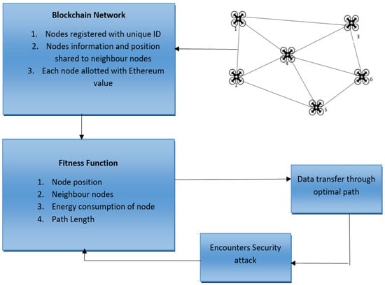 40]. The proposed RUPOA algorithm maintains a list of all its neighbour nodes, which are registered in the UAV network using the blockchain smart contract. Thus, each node is identified in the network and achieves non-repudiation. The proposed RUPOA algorithm calculates the fitness function value, which provides all the available paths for each node and its neighbour nodes. The algorithm also provides the optimal path based on the neighbour node position, path length and energy consumption of each path, and the optimal path is achieved with fewer parameters. Thus, each node in the UAV network maintains a routing table which contains the details calculated from the fitness function, and the RUPOA algorithm generates the optimal path. Each node’s identity is secured based on its assigned blockchain smart contract and gasLimit so it achieves non-repudiation. When the network encounters security attacks such as MITM, DoS, wormhole or Sybil attacks, the malicious node resource is drained and it exceeds the gasLimit, which automatically removes it from the UAV network. Then the next neighbour node is selected that provides the next best optimal path, as represented in