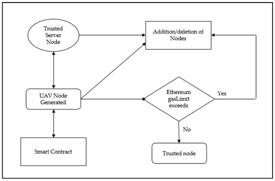 For secure communication in the UAV network, a smart contract is deployed in the server node. Here in this paper, it is assumed that the trusted nodes are server nodes. All the UAV nodes in the network are registered in the smart contract. Only the trusted server node can authorize the UAV nodes to be added or removed from the network, so any new node that needs to be added to the network is authorized by only the server node. Once the nodes are registered in the network, the node’s identity is managed by the smart contract which helps it to track the activities of the nodes. When any node encounters a security attack or if the server suspects any malicious activity in a node, the server can remove the node from the network, which secures the UAV network from security attacks.