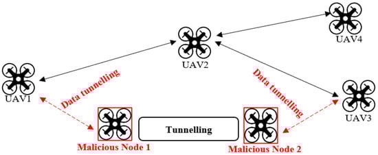 Figure 6 describes the wormhole attack also known as the tunnelling attack. This attack is achieved by compromising one or two nodes, to tunnel the data. And by tunnelling, the malicious node tries to steal the data from another node. The proposed blockchain model detects this attack when there is a change of activity in the UAV network. Since the server node is capable of adding/removing the UAV nodes in the network, it monitors the activity of all the registered nodes in the network.