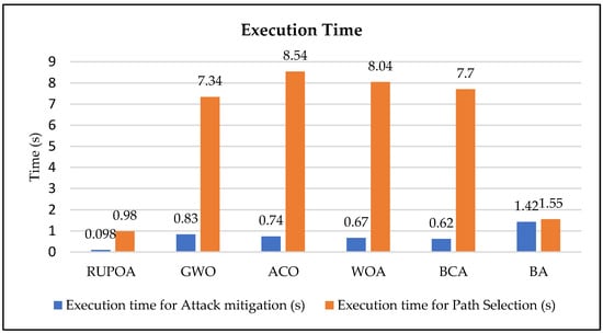 Figure 10 illustrates a comparison of the average execution times of the proposed and existing algorithms. The values are calculated for an increasing number of UAVs (10, 20, 30, 40 and 50) in the swarm network and the average results are compared. The average results show that the proposed algorithm provides a secure optimal path in a shorter execution time compared with the existing algorithms.