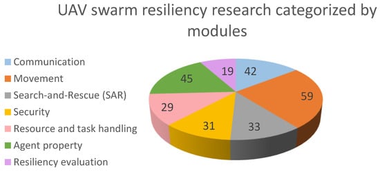 To gain an understanding of the trends in current research, it was first necessary to construct a database of related studies. The two most popular research databases were used, Google Scholar and Scopus. IEEE and MDPI databases were also examined. However, since the results from both are indexed by Google Scholar, mentioning it gets precedence. While Google Scholar provides higher numbers for the i and h indices due to its wider reach and slightly different citation trawl method, Scopus is more ordered and allows better access to articles. The primary keywords used in the search process were UAV, RESILIENCY, and MAS. Keywords were used to search the title and abstracts of articles. A time constraint of the past 10 years (2011–2021) was applied to search for articles plus current work through June 2022. More than 1100 hits were generated on relevant research. These were manually filtered to remove duplicates and incorrect entries. Incorrect entries included resiliency recommendations for electric grids, outer space, and nonrelated cyber-physical systems. An analysis of the remaining 258 papers provided us with seven different sections that formed the UAV swarm components classified in Figure 1. All research was then categorized individually into these seven components with cross-links established for papers that had a combination of or covered multiple modules. The definition for combination modules was defined as research making progress in multiple subcategories, such as algorithms for heterogenous agents performing balanced path planning [24] or management architectures for drone service platforms that provide mission planning and resource handling for agents [25].