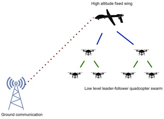 A high-altitude fixed-wing aircraft providing connectivity support to a low-altitude quadcopter swarm arranged in a multi-level hierarchical tree topology.