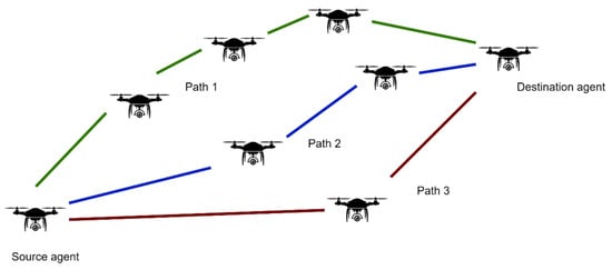 Multi-hop communications are key to such models where relays are used to read a wider range. While [42] designates articulation agents to balance mission with network connectivity, it brings all nodes within the same operational space. Without an excellent swarm defense and onboard intrusion detection system (IDS) in place, enemy agents can focus their attack on mission-critical nodes and target them first to bring down swarm operations. Spreading relay nodes over a wider range of topography can bring down the ROF (rate of failure). For example, if the aircraft was flown at a sufficiently low flight altitude, ground-based relay stations could be used. Figure 6 shows a multi-hop data pathway selection process that can occur between a source agent and a destination agent to relay messages. The routing protocol governing this transmission has to consider various factors such as agent locations, energy required, transmission time, etc.