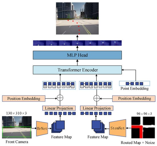 Given a front-view RGB image and a global planning local map , our objective is to learn an end-to-end neural network to predict the future waypoints of the vehicle in the front-view image; they can be expressed as Equation (1). Among them, represents the pixel coordinates of the prediction points in the front-view image, and the number of prediction points is k.