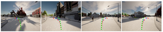 Let be the n waypoints on the front-view image predicted by the model at time t, use the 2D-to-3D projection trick [9] to project the front-view image points to the vehicle body coordinate system, and obtain n waypoints under the vehicle body coordinate system at time t, denoted by . Calculate the pose transformation matrix from time to time t according to the odometer of the vehicle, then the waypoints of the vehicle body coordinate system at time are transformed to the waypoints under the vehicle body coordinate system at time t, which can be calculated by Equation (10).