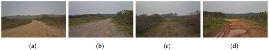 Examples of off-road scene road conditions. (a) shows the dirt road, (b) shows the gravel road, (c) shows the weed road, and (d) shows the puddle road.