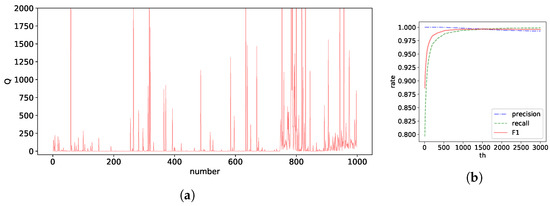 Threshold selection. Figure (a) records the change in the Q value of the first 1000 samples in the training set; (b) is the F1, precision, and recall corresponding to different threshold sizes.