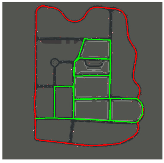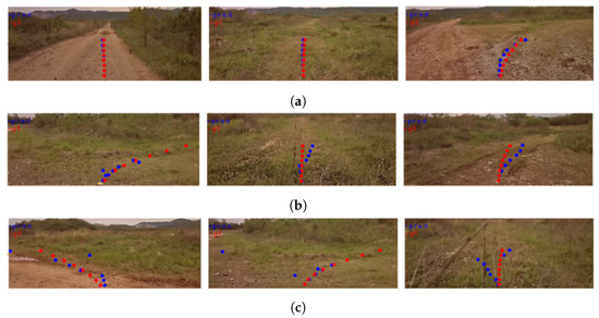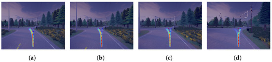 As shown in Table 5, in the CARLA environment, “Two models + multiple frames” is still the best, and “One model + one frame” is the worst. The difference in performance among the three groups was not particularly significant because the weather and light of Town5 changed sharply, which did not appear in the training set, so the overall performance decreased. However, in spite of this, the two models is still better than the one model, and the performance of the model is significantly improved after multi-frame optimization. In the cross-country environment, “Two models + one frame” is 10.6% higher than “One model + one frame” because during the mixed training of “junctions” and “non-junctions”, the model is overfitted to “non-junctions”, but the learning ability of the model to the “junctions” sample is improved after separate training. “Two models + multiple frames” is 2.3% higher than “Two models + one frame”. The visualization result is shown in Figure 11. When the prediction of the second frame is wrong, the result of multi-frame accumulation can make up for the gap in the output, so the model is more robust.