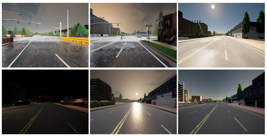 The tests were conducted in a real off-road environment and Town5 in CARLA, respectively, and the complexity of road conditions was reflected through texture changes and light changes. The off-road environment is shown in Figure 5 of Section 3.3. The environment in Town5 is shown in Figure 10, adding changes in different weather and light. The data settings for training and testing under the two environments are shown in Table 4; in CARLA, the model was trained in Town1, Town2, Town7 (the light change was not obvious) and tested in Town5. The training and testing venues in the cross-country environment are the same, but the routes are different. The experimental process is the same as above, and the results are shown in Table 5.