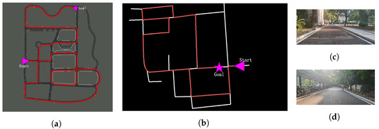 Route map. (a) is the route of Town7, (b) is the real campus environment route, and the start and goal are marked on the map. (c andd) show the real campus environment maps.