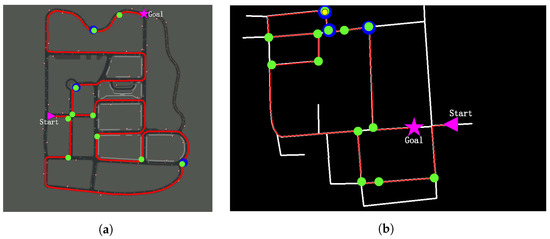 Online test manual intervention record results. (a) is the result of the test in Town7, and (b) is the result of the real campus environment test. The red line is the test route, and the green, blue, and yellow points are the manual intervention positions of “One model + one frame”, “Two models + one frame”, and “Two models + multiple frames”, respectively. The numbers of interventions of “One model + one frame”, “Two models + one frame” and “Two models + multiple frames” in the virtual environment are 10, 3, and 0, and in the real environment it is 13, 3, and 1.