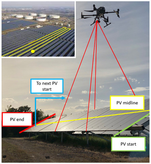 - Moradi Sizkouhi, A.M.; Majid Esmailifar, S.; Aghaei, M.; Vidal de Oliveira, A.K.; Rüther, R. Autonomous Path Planning by Unmanned Aerial Vehicle (UAV) for Precise Monitoring of Large-Scale PV plants. In Proceedings of the 2019 IEEE 46th Photovoltaic Specialists Conference (PVSC), Chicago, IL, USA, 16–21 June 2019. [Google Scholar]