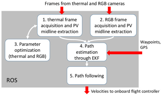 The software architecture implemented in ROS [48] is shown in Figure 2. ROS nodes (1) and (2) acquire and process raw frames from the RGB and the thermal camera and perform PV module segmentation (see Section 4.1 and Section 4.2). As an output of this process, each node returns the parameters, in the image frame, of the straight lines running in the middle of the detected PV module rows. To increase segmentation accuracy with varying environmental conditions, node (3) implements an optimization procedure to find the best parameters for segmentation: some details about this procedure are in Section 4.3. Node (4) merges subsequent observations, independently performed by the two cameras in subsequent time instants. Because the parameters of straight lines independently extracted by (1) and (2) may be affected by errors, an EKF is used to estimate the PV midline by merging the observations provided in real time by nodes (1) and (2) with a priori knowledge (see Section 5.1 and Section 5.2). Finally, node (5) uses the estimated reference path to control the UAV through visual servoing (Section 5).