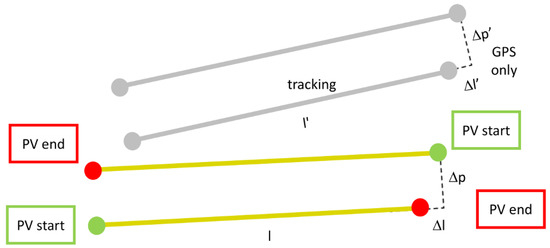 As already discussed, real-time segmentation and visual tracking of PV module rows may play a key role in successful navigation. Indeed, waypoint-based navigation relying on the embedded positioning system of the UAV (typically merging GPS, IMUs, and compass) has well-known limitations: the absolute position of PV start and PV end waypoints, as well as GPS data, may be affected by large errors in the world frame. In contrast, by using visual servoing to move along a PV row, we only need to ensure that the relative position of adjacent waypoints and the small UAV displacement from a PV module row to the next one performed with GPS only are sufficiently accurate. Figure 3 shows this concept: the colored part of the figure represents a priori computed waypoints; the gray part represents the observed position of PV module rows while tracking them. The proposed solution works even when the absolute error between the a priori computed and the observed position of PV module rows is huge, given that and (the additional requirement holds if one uses GPS to measure the length of the PV module row instead of implementing some sort of “end-of-row detector”). These assumptions look reasonable, as georeferenced waypoints computed from Google Earth images and GPS data may be affected by large biases (which, in the case of GPS, vary with time) but tend to be locally coherent—i.e., the relative error of waypoints (respectively, GPS data) with respect to previous waypoints (respectively, GPS data acquired in nearby locations) is small.