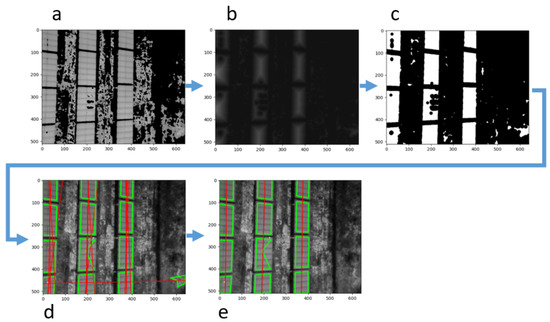 The algorithm developed to process thermal images is almost completely reused for RGB images, except for the initial steps required for PV module segmentations; see Figure 5a,b.