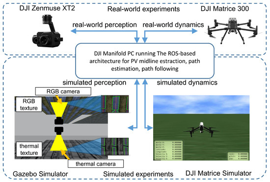 During real-world experiments, images are acquired through a DJI Zenmuse XT2 camera and used to control a DJI Matrice 300. During simulated experiments, images are acquired in a simulated PV plant in Gazebo and used to control the UAV’s dynamics in the 300 DJI simulator. The positions of the RGB (looking upward) and thermal (looking downward) cameras are updated accordingly to the UAV’s simulated dynamics.