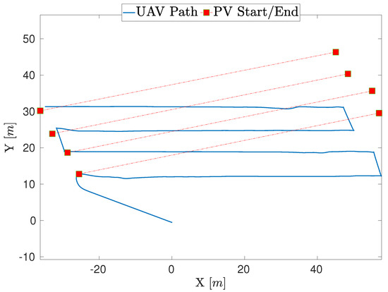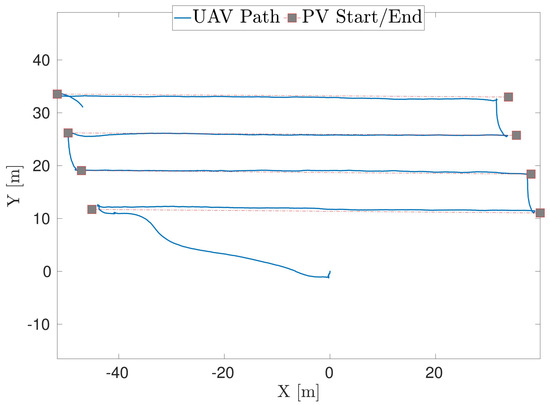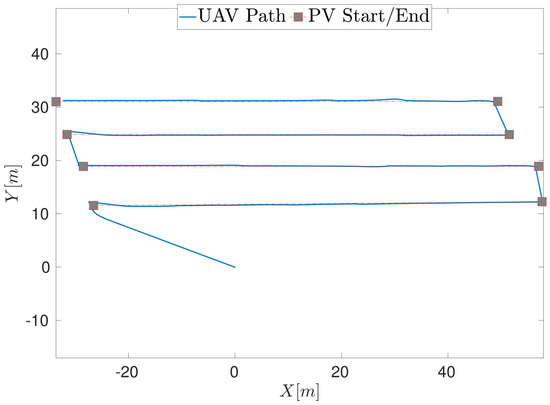 The mission consisted of inspecting four parallel PV rows. The waypoints were assumed to be correctly placed at each row’s start and end without errors. During navigation, the UAV velocity had a constant value of m/s, and the UAV flew at a constant height of 15 m from the take-off point. Please note that, at a 15 m height, a speed lower than 2 m/s is appropriate to prevent blurred images and ensure image overlapping.
